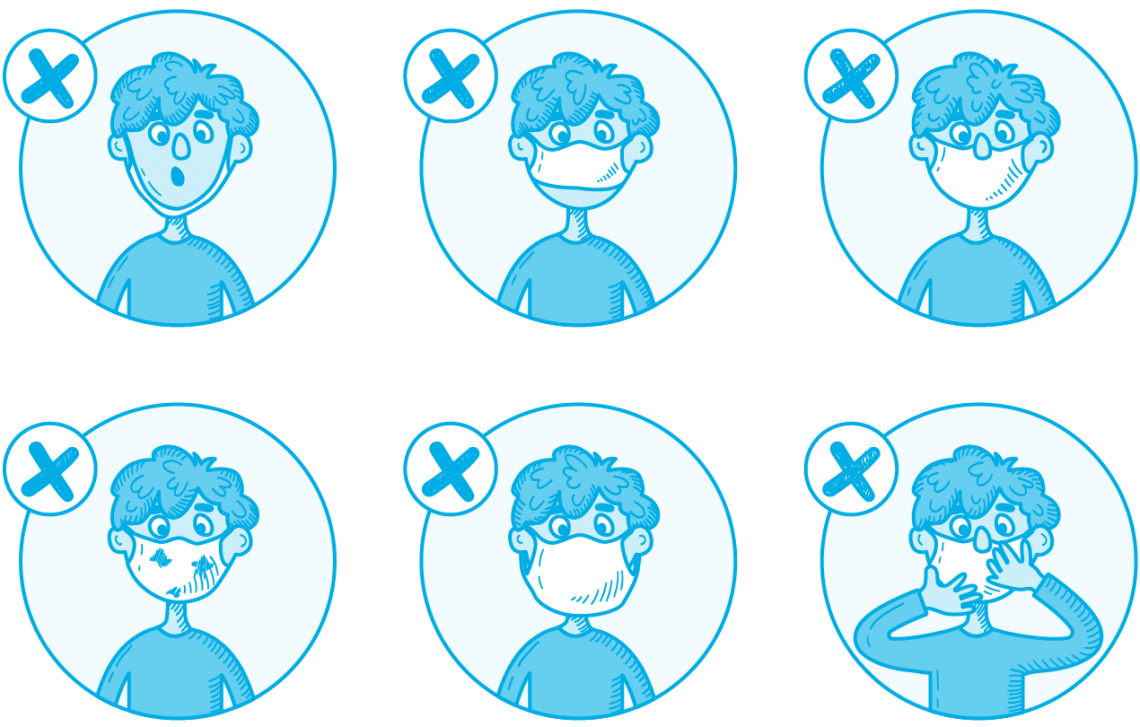 - ماسک را زیر دماغ یا چانه نکشید یا آن را روی سرتان نزنید – برای اینکه ماسک مؤثر باشد باید دهان و بینی را بپوشاند.